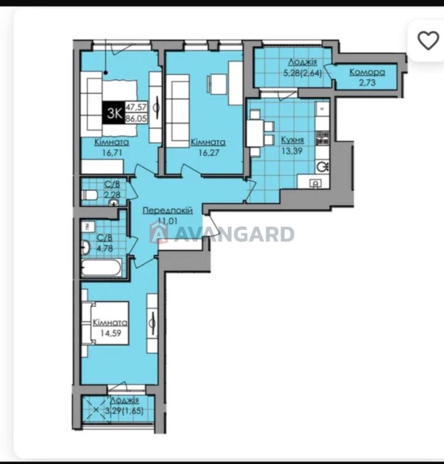 Кімнати: 3 спальні, кухня, 2 санвузли, комора