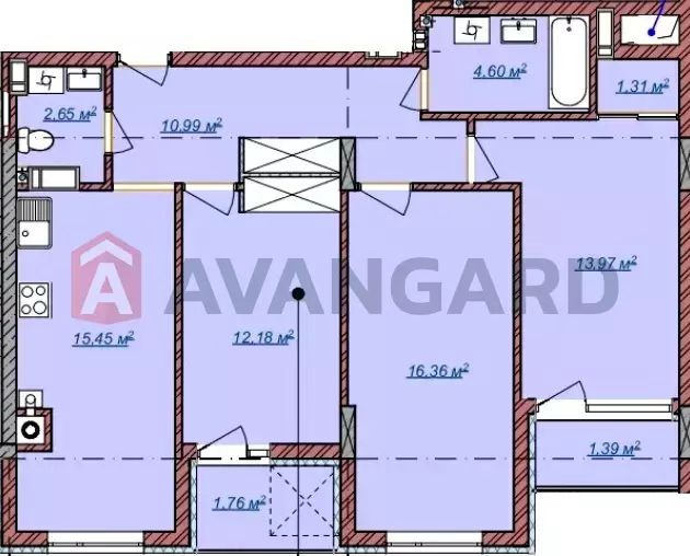 У квартирі два санвузли, три просторі кімнати правильної форми з великими панорамними вікнами, кожна кімната має вихід на лоджію та простора кухня з місцем під робочу зону 15 м².