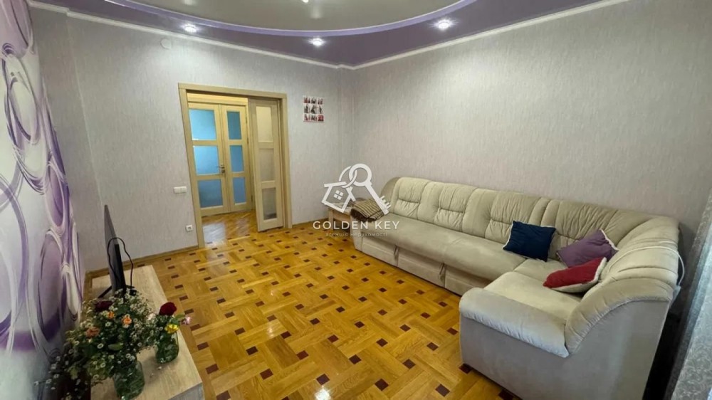 Квартира розташована на комфортному третьому поверсі п'ятиповерхового будинку, не кутова. Загальна площа 74 м2, житлова 50 м2, кухня 8 м2. Всі кімнати окремі, санвузол роздільний. Вікна металопластикові, балкон засклений, обшитий зсередини і укріплений ззовні. Опалення централізоване, труби замінені. Проводка мідна, розведена по всій квартирі, окремо виведені автомати, встановлений двозонний лічильник "День-Ніч". Виконане вирівнювання підлоги, паркет. На стінах шпалери. Стеля натяжна. Ремонт зроблений у 2020 році з використанням якісних і сучасних матеріалів. Подвійні вхідні двері. Всі меблі і техніка залишаються новим власникам. Квартира повністю готова до проживання.