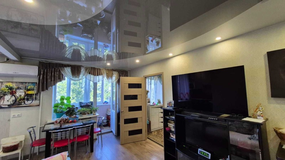 У квартирі виконаний якісний ремонт: нова проводка, вирівняні стіни та підлога, гарної якості ламінат, натяжні стелі з переходом кольору та з точковим освітленням, балкон під ключ, вбудована на індивідуальне замовлення кухня, встановлений кондиціонер.