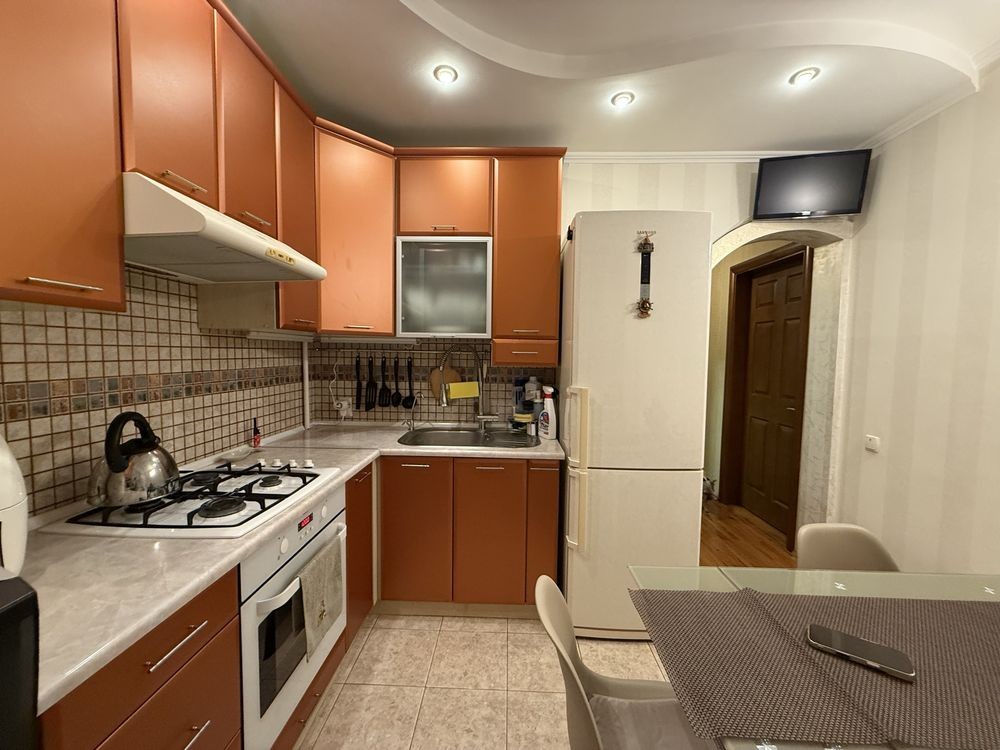 Кухня: Простора та функціональна, обладнана сучасними вбудованими меблями та технікою. Стильні фасади та якісна фурнітура створюють атмосферу затишку для сімейних вечерь.