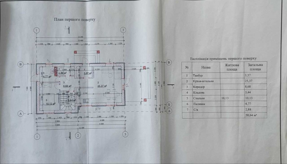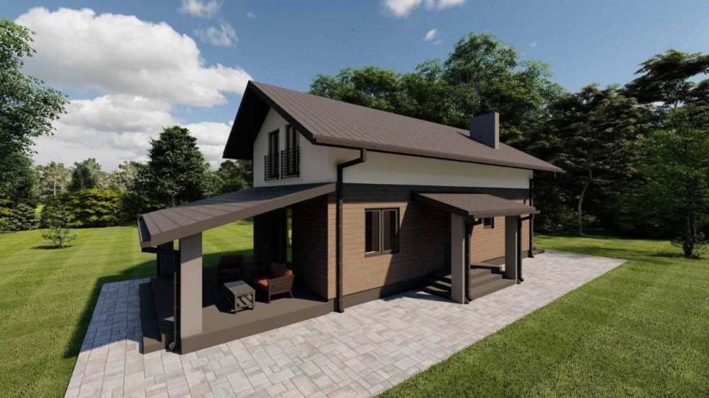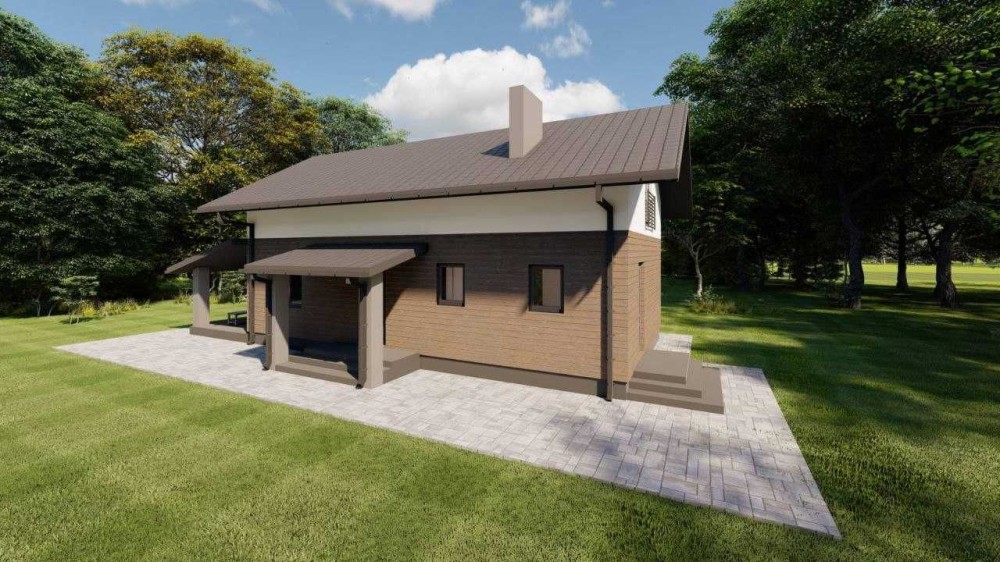 Перший поверх включає простору кухню-студію площею 25 м.кв з виходом на терасу, спальню/кабінет 10.13м.кв, паливну кімнату площею 5 кв. м. з можливістю встановлення твердопаливного котла, кладову3.5м.кв, санвузол.