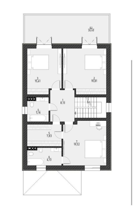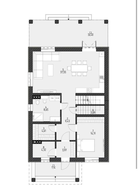 1 поверх - кухня-вітальня з виходом на терасу, гостьова спальня/кабінет, котельня, гардеробна, санвузол, додаткове технічне приміщення.