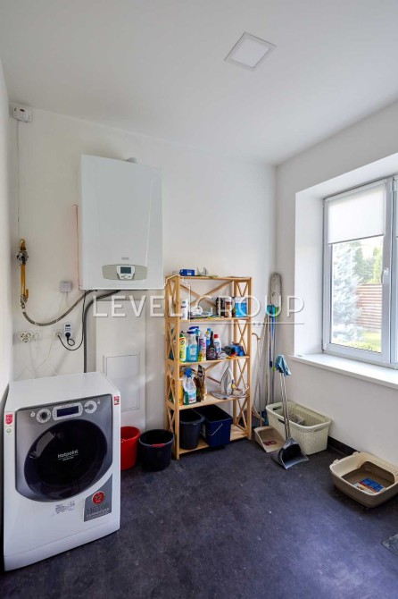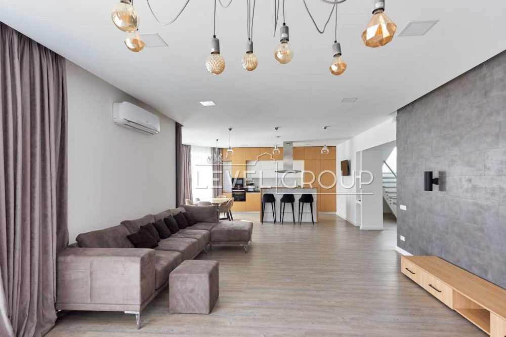 Будинок виконаний у сучасному стилі з якісних матеріалів, має зручне планування: світла вітальня, простора кухня, кілька спалень та санвузлів.