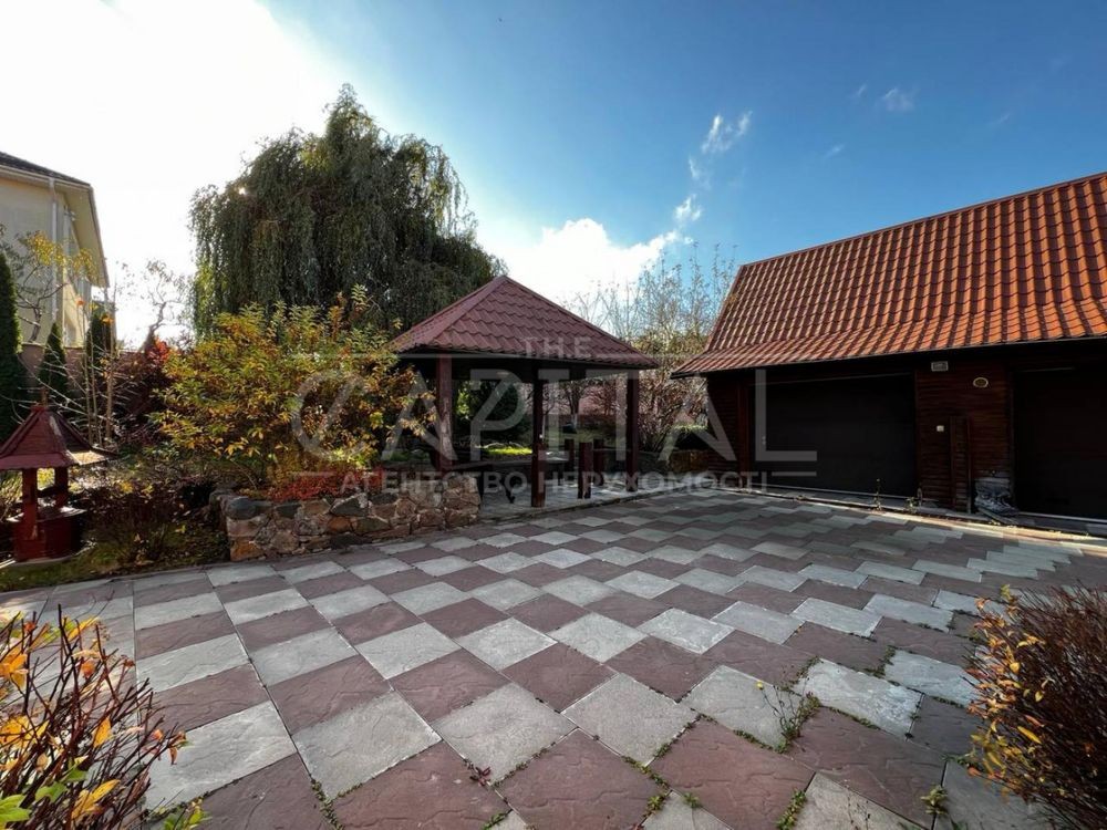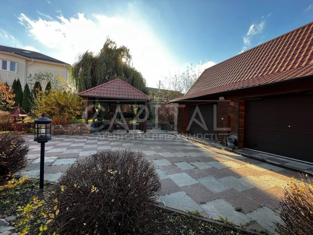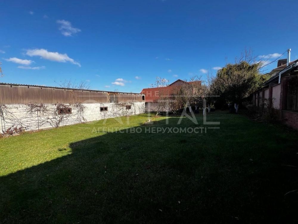 Доглянута ділянка з продуманим ландшафтом, садом із фруктовими деревами. По периметру ділянки цегляний паркан, на ділянці розташовані два гаражі з автоматичними воротами, зона барбекю, альтанка, так само на ділянці є приміщення загальною площею 200м2.