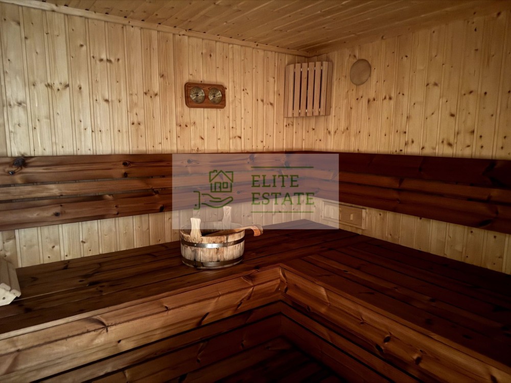 1-й поверх: велика вітальня з каміном (друге світло), кухня, їдальня, гардеробна, c/в, гостьова спальня, кімната відпочинку, сауна, пральня, бойлерна, гараж на 2 авто.