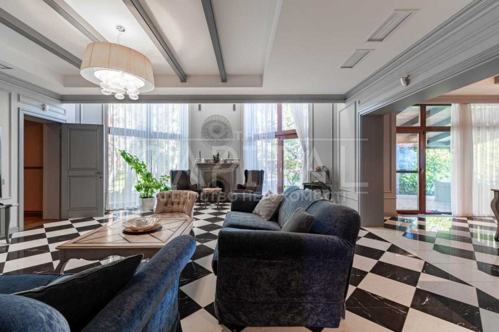 • Велика вітальня з ефектним підвійним світлом та панорамними вікнами, наповнена природним світлом – ідеальне місце для затишних сімейних вечорів біля каміна чи прийому гостей