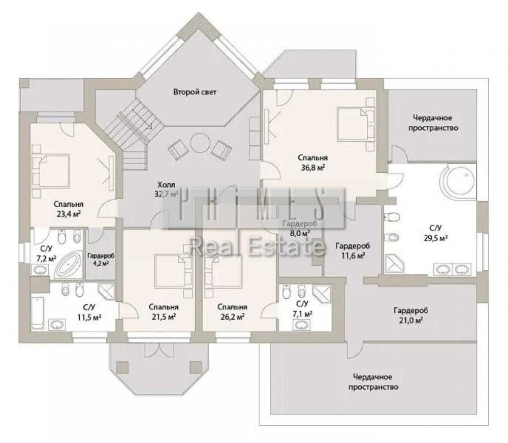 На другому поверсі розташовані 4 спальні з гардеробом та санвузлом усередині кожної кімнати.