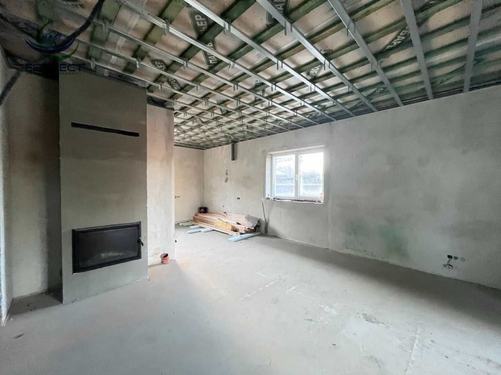 Планування: тамбур, коридор, вітальня з вже встановленим каміном фірми Dovre та виходом на криту терасу, кухня, дві спальні, санвузол, технічне приміщення та мансардний поверх оздоблений деревом з відкритим простором.