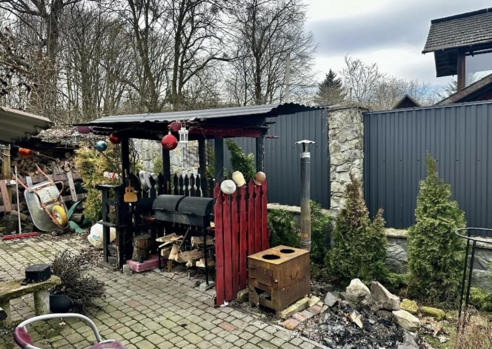 Територія поруч будинку облаштована красивим ландшафтом, маленьке озерце на подвірʼї, мангал на зона для відпочинку, декоративні дерева і композиції.
