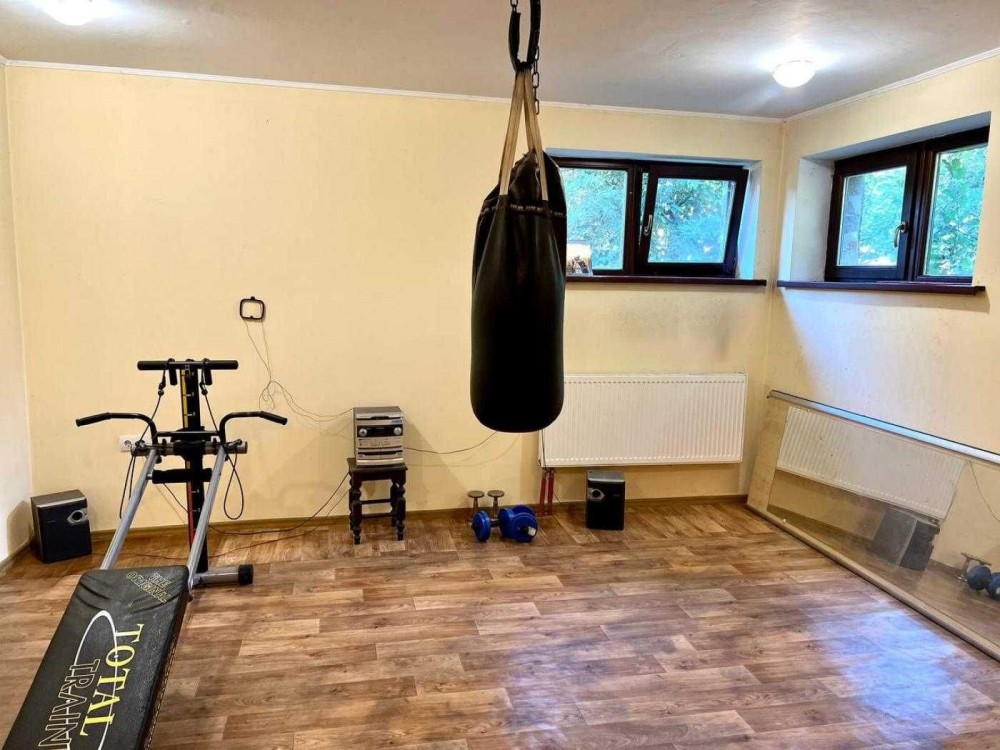 На першому поверсі - гараж , місце під сауну, ванна кімната (джакузі нове), кімната відпочинку, спортзал , 2 комірки, котельня, підігрів підлоги, індивідуальне опалення котел"Buderus".