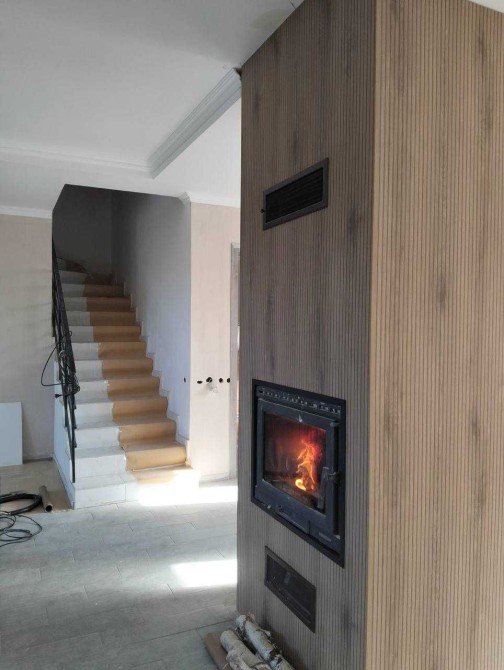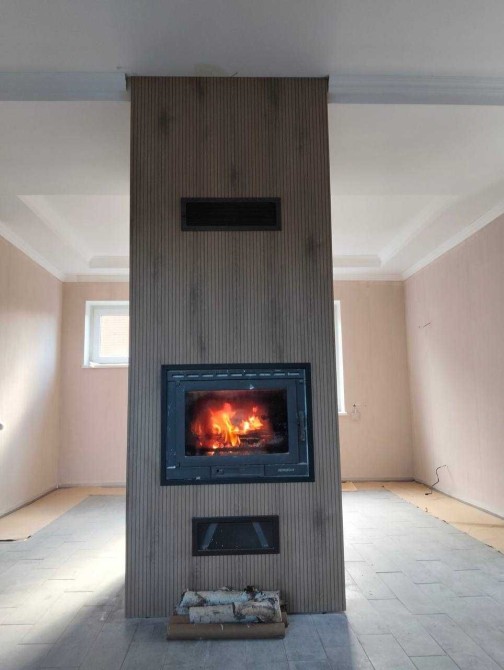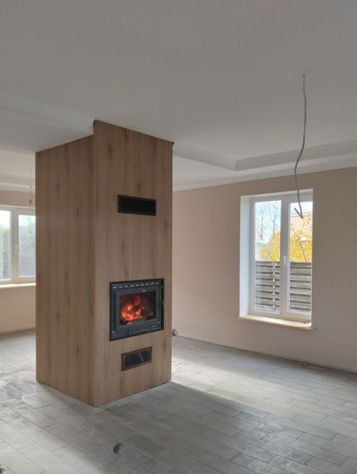 На першому поверсі кухня-студіо, з каміном.