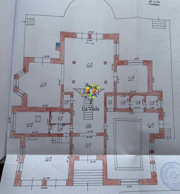 загальна площа 643 м2 (перший поверх 315 м2, другий 137 м2, цокольний поверх- підвал 190 м2);