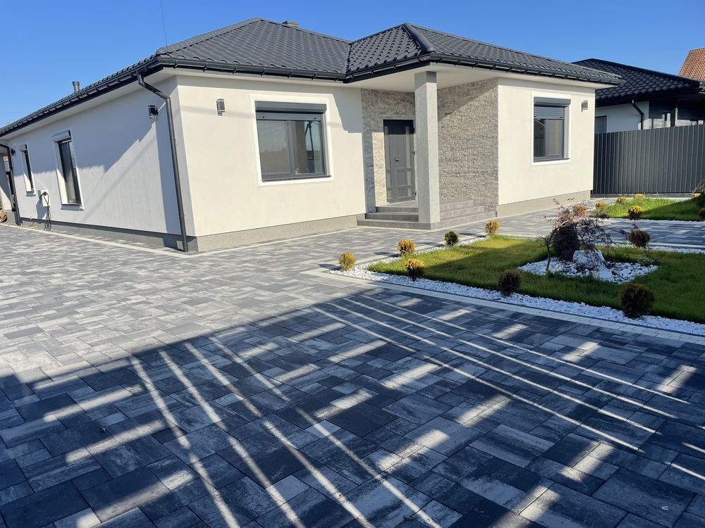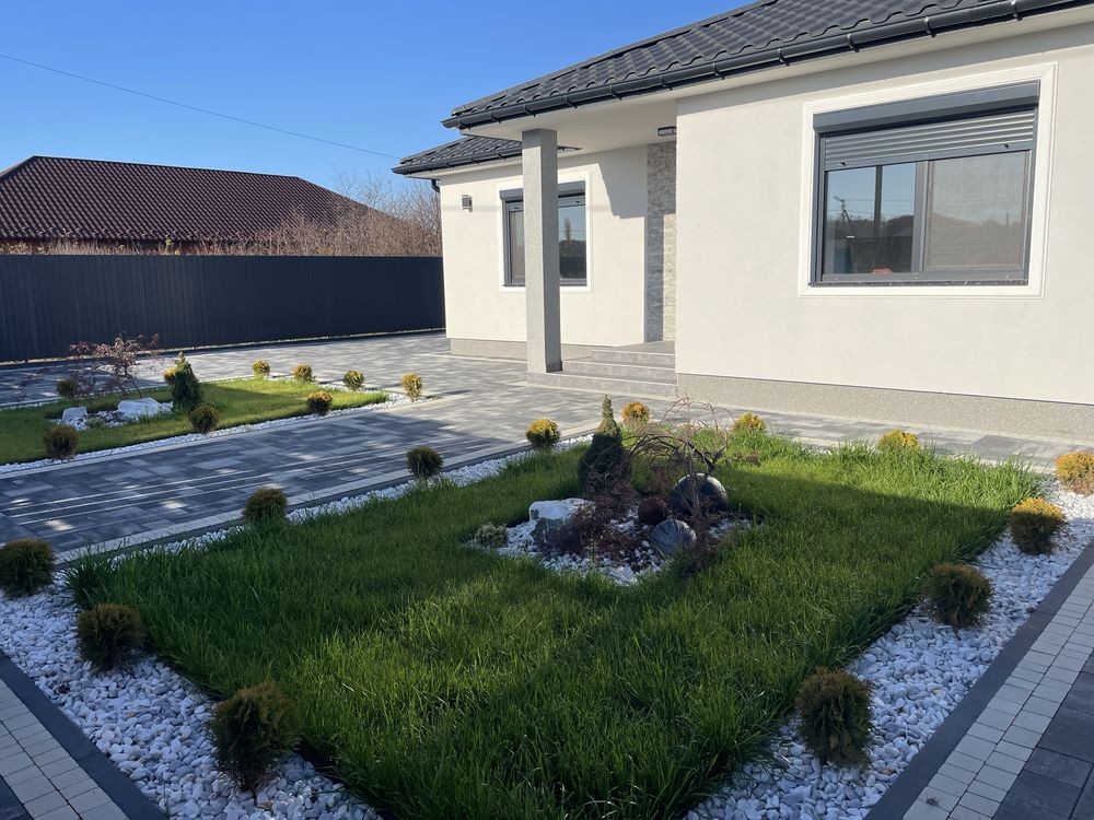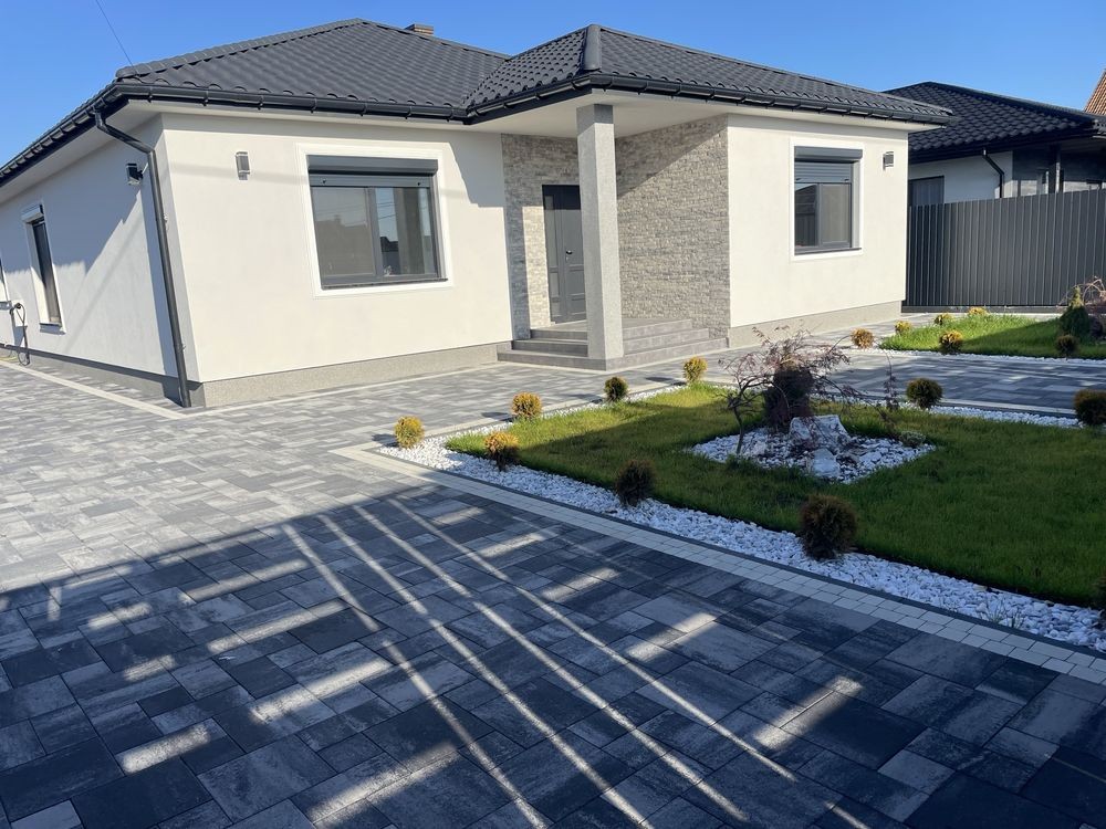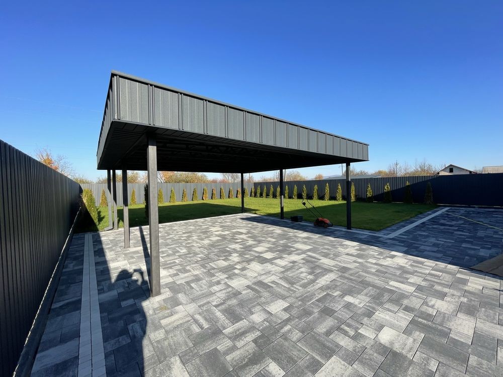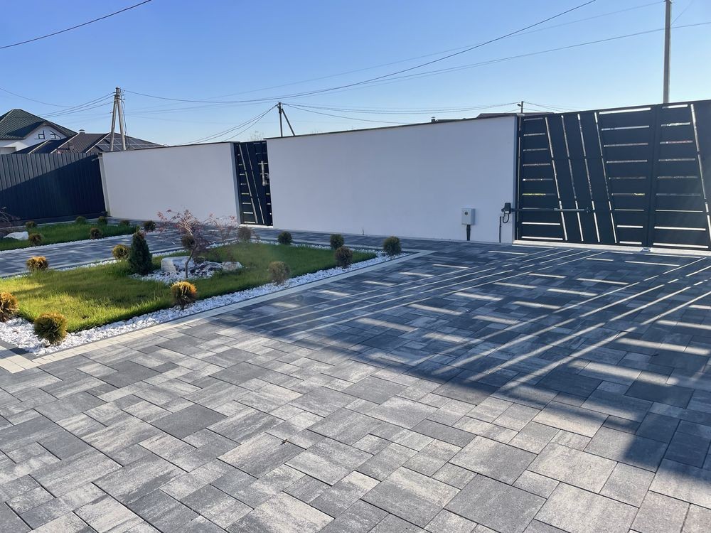 На території навіс для авто, ворота на автоматиці, бруківка у дворі, зелена зона.