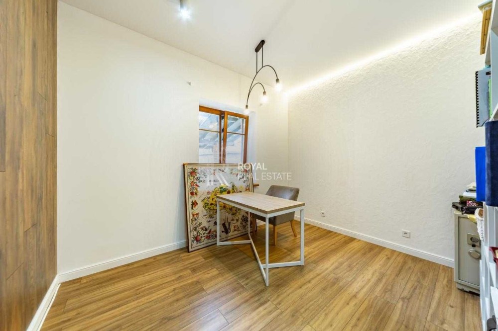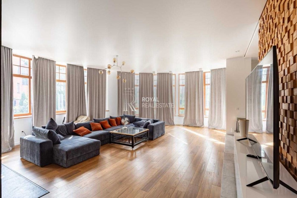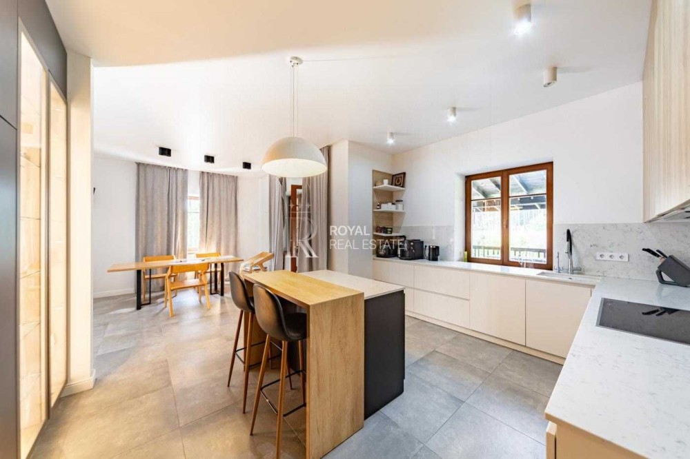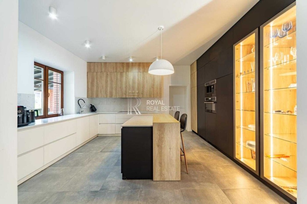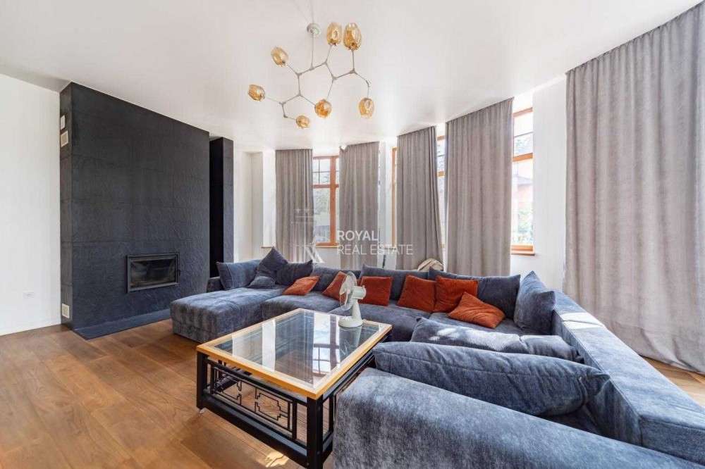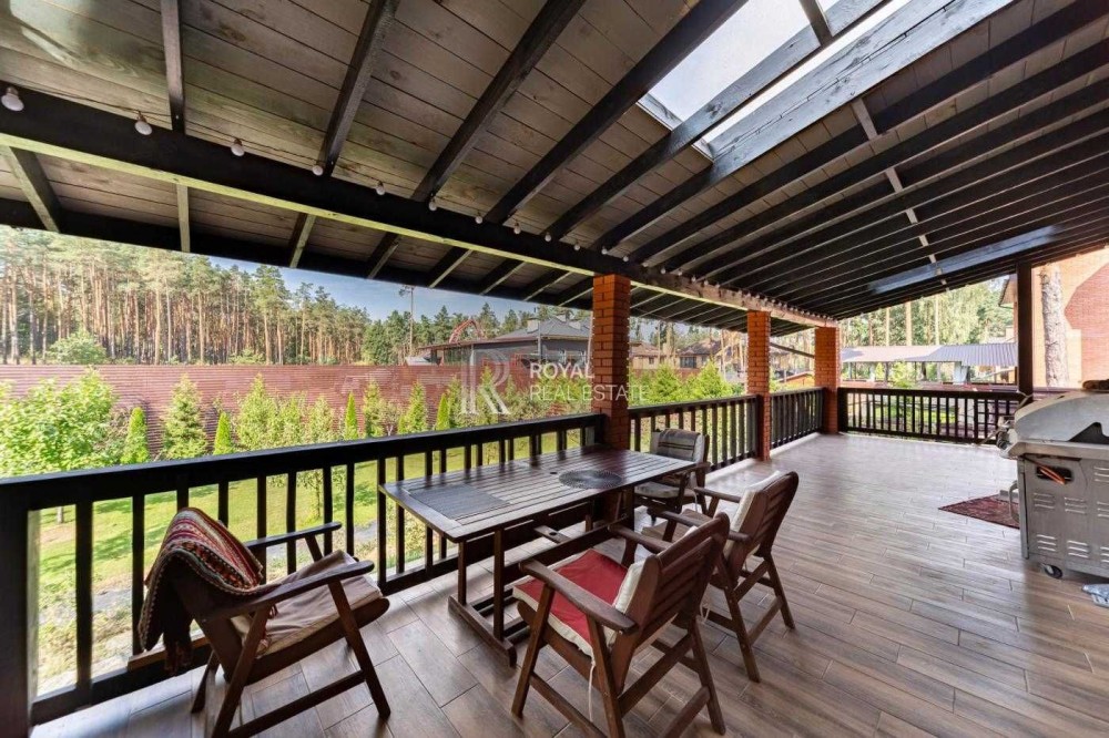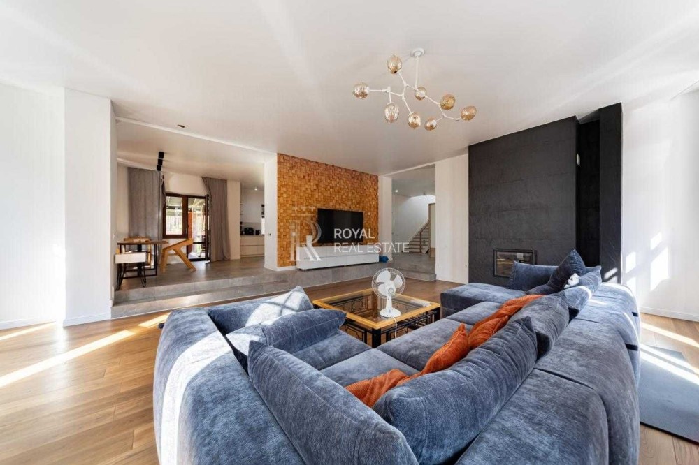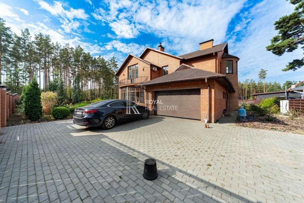 Загальна площа будинку становить 330 кв. м, має 2 поверхи і містить 7 кімнат, включаючи простору вітальню з каміном і виходом на відкриту терасу, кабінет, гардеробні, комори, та пральню. Також є теплий гараж.
