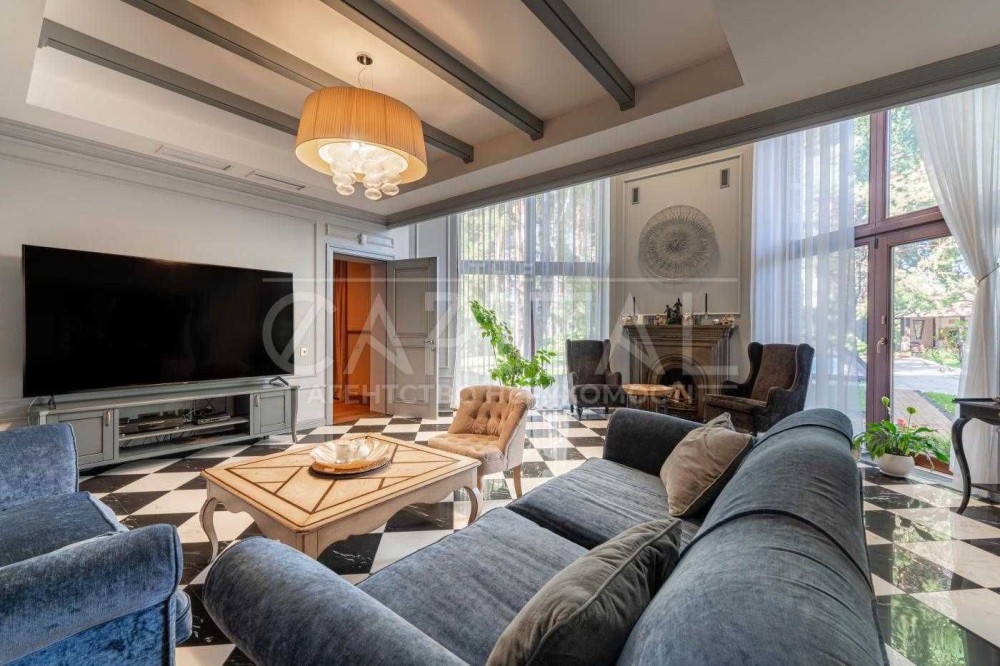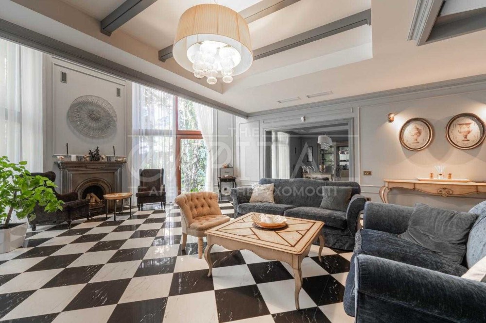 • Велика вітальня з ефектним підвійним світлом та панорамними вікнами, наповнена природним світлом – ідеальне місце для затишних сімейних вечорів біля каміна чи прийому гостей
