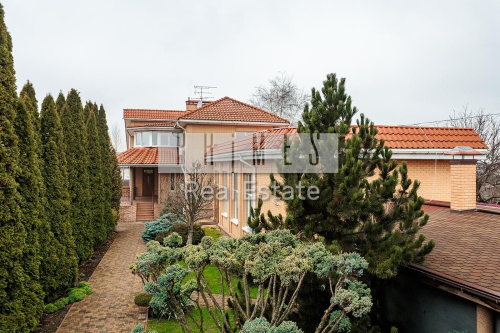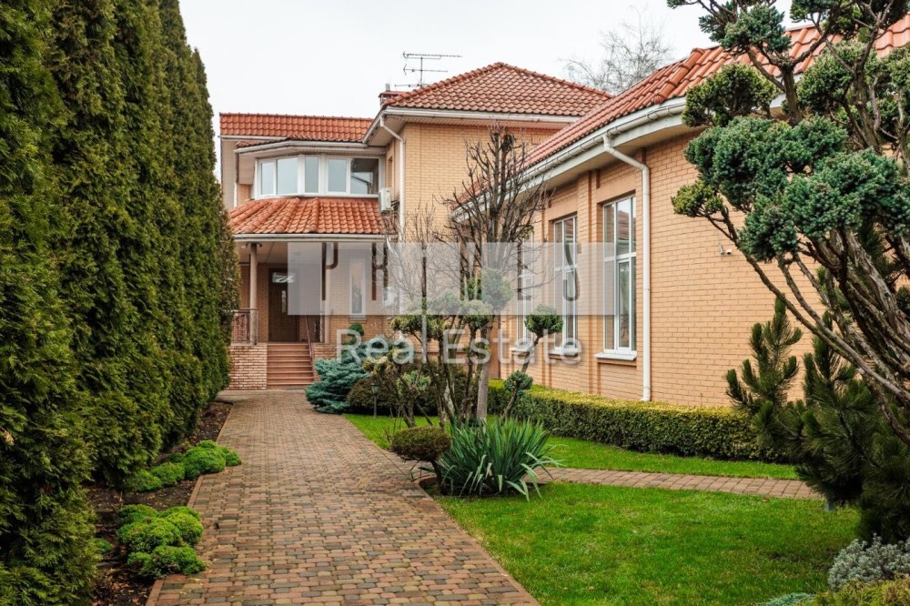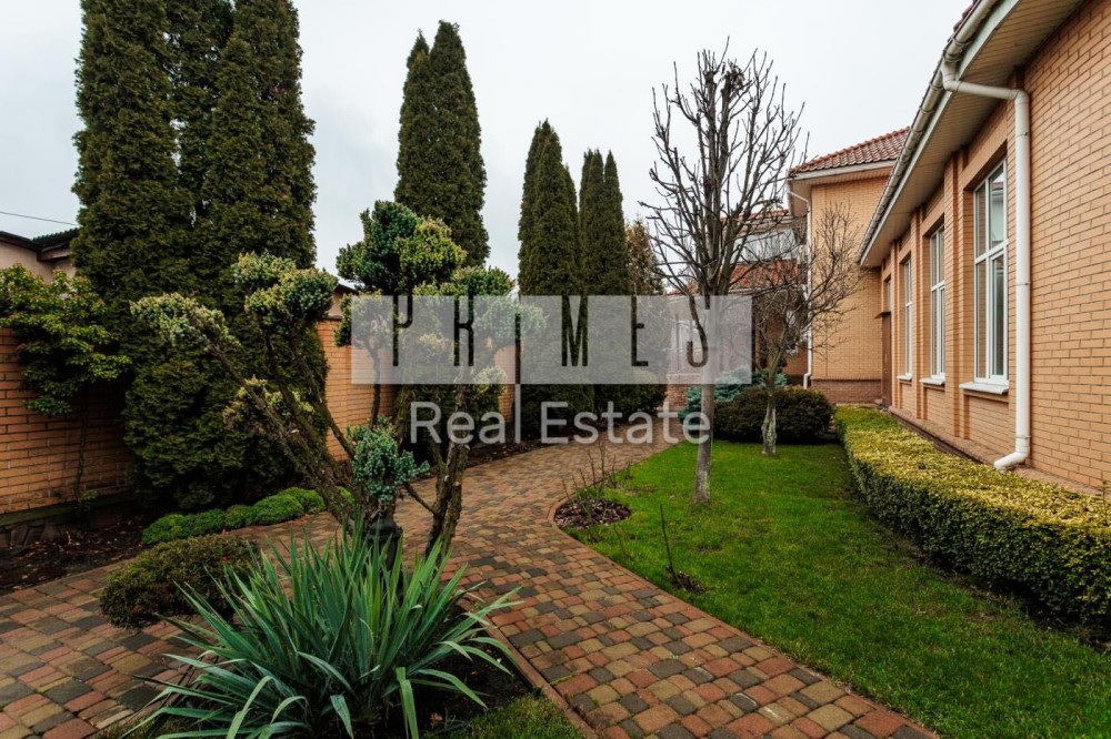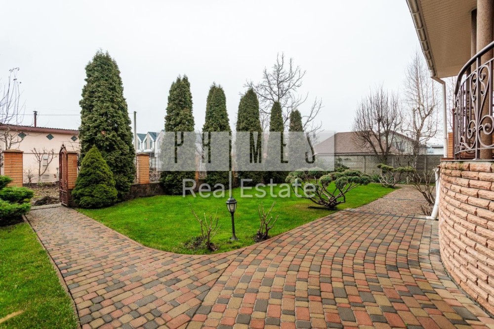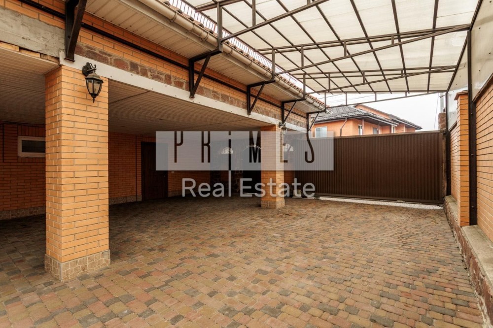 Софіївська Борщагівка, Києво_Святошинський рн. Сучасний обладнаний двоквартирний житловий будинок 420м.2, окремою будівлею зимового басейну площею 85м.2 та гостєвим будинком з гаражем на два авто, цегляна бесідка з каміном. Ділянка площею 16,5 сотки украшена та озеленена. Електрика: два особисті рахунки на 50кв. та 5кв., додатково дизель генератор з автоматикою на 11 кв.ч . Водопостачання та каналізація: централізована власна свердловина та власний септик. Зручне розташування – 350м. від Кільцевої дороги, у районі повороту з Кільцевої дороги на м. Вишневе. По вулиці проходять маршрутки до ст. метро "Васильківська" та "Академ містечко". Розвинута інфраструктура: у радіусі до 1км банки, супермаркети, школи, приватні дитячі садки, школи, спортзали, салони краси та інше. На території ландшафтний дизайн: туї, смарагди, ялинки, самшиті, спірея, листяні дерева, інші декоративні насадження, газон. Основний будинок розташований у глибині ділянки, із заїздом від воріт 20м. Будинок побудований з екологічно чистих матеріалів, червоний керамічний цегла з внутрішньої сторони та облицювальний цегла ззовні, керамічний черепиця. Власна лінія електропостачання безпосередньо від трансформатора на 50 кв. Додатково встановлено дизель генератор на 11кв із системою автоматичного вмикання та виключення при зникненні електрики. По всьому, будинку встановлено охоронну та пожежну сигналізацію, систему відео спостереження, а також будинок під цілодобовою охороною та контролем ДЗГ. Стіни оздоблені дорогою декоративною штукатуркою (Ottocento, Marmofloat, Baldini Vernici). Підлога мармурова плитка, мозаіка, а також паркетна дошка. По всьому будинку, де обладнано кахель, водяна тепла підлога. В основному та гостєвих будинках 2 котли німецького виробника Buderus, власна свердловина, а також є централізоване водопостачання та каналізація. Встановлена ​​система очищення води антибактеріальна та вугільна фільтрація на всі приміщення та обладнання. Двері та сходи з натурального дерева (дуб). Сантехніка та побутова техніка відомих світових брендів. Будинок укомплектований дорогими меблями з натуральних матеріалів. Гараж на 2 авто та можливе паркування на під навісом території ще 3-4 авто.