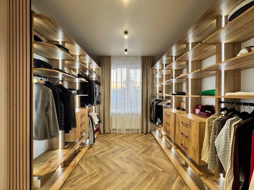Планування: кухня-вітальня, 2 санвузли, гостьова кімната, дитяча спальня, батьківська спальня, велика гардеробна з кладовою, кабінет, технічне приміщення.