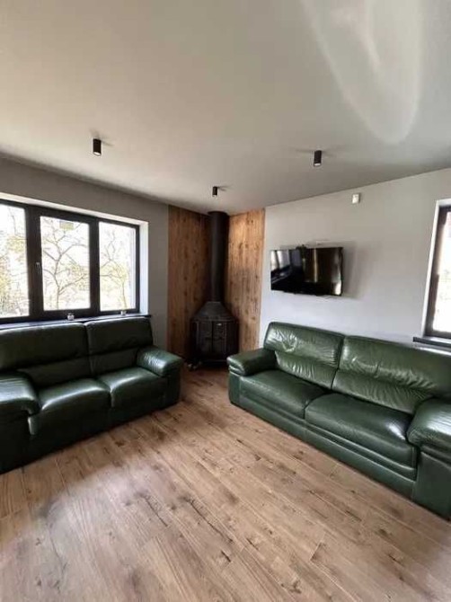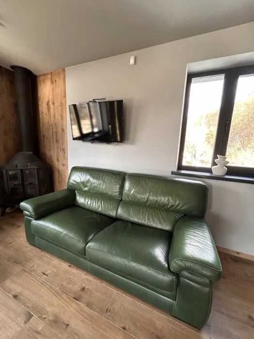 Простора кухня-вітальня. Два шкіряні дивани (один розкладний), телевізор 45”, твердопаливний камін із рукавом обігріву на другий поверх, кондиціонер (працює до -20°). Повний комплект побутової техніки: посудомийна машина, індукційна плита, духова шафа, мікрохвильова піч, витяжка, холодильник. Буде встановлена нова кухня.
