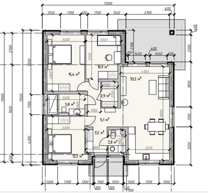 Велика кухня-вітальня 33 кв.м., три спальні, санвузол, гардеробна та тераса.