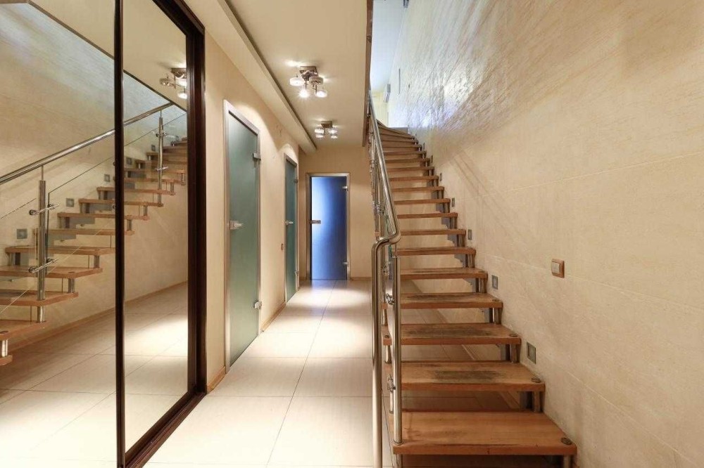 На першому поверсі кабінет з виходом на терасу. На другому - простора кухня-студія. На третьому - дві спальні та санвузол з гідромасажною ванною. Мансарда - дві спальні та санвузол. На цокольному поверсі - гараж, пральна кімната. Є горище де, за потреби, можна облаштувати ще додатковий простір.