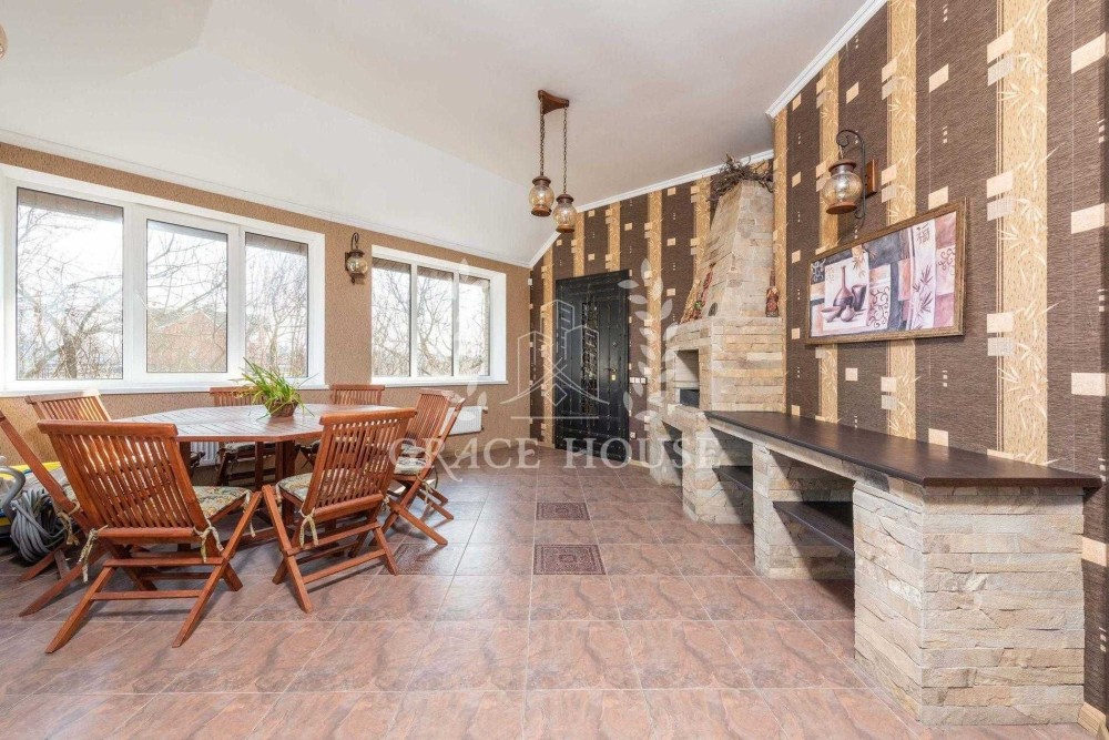 - Вітальня, кухня, їдальня, спальная для гостей, передпокій, санвузол з душовою кабіною, закрита веранда (камін/барбекю), гараж (2 авто, автоматичні ворота Hormann);