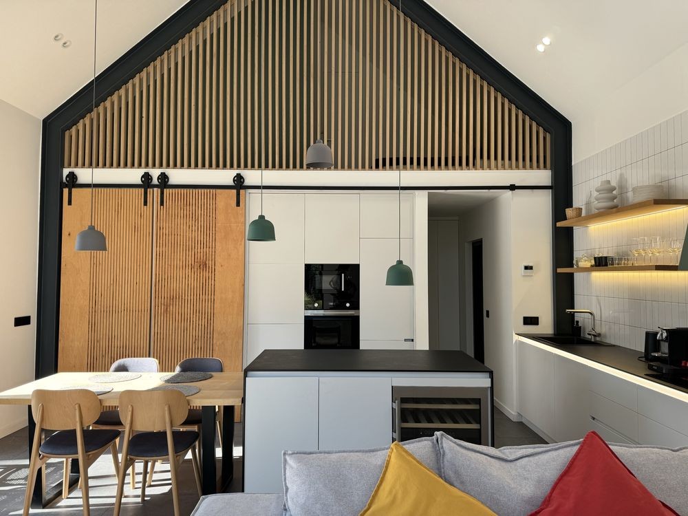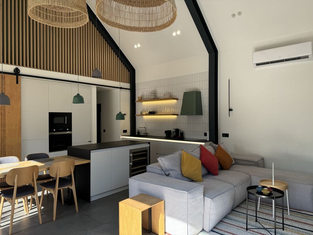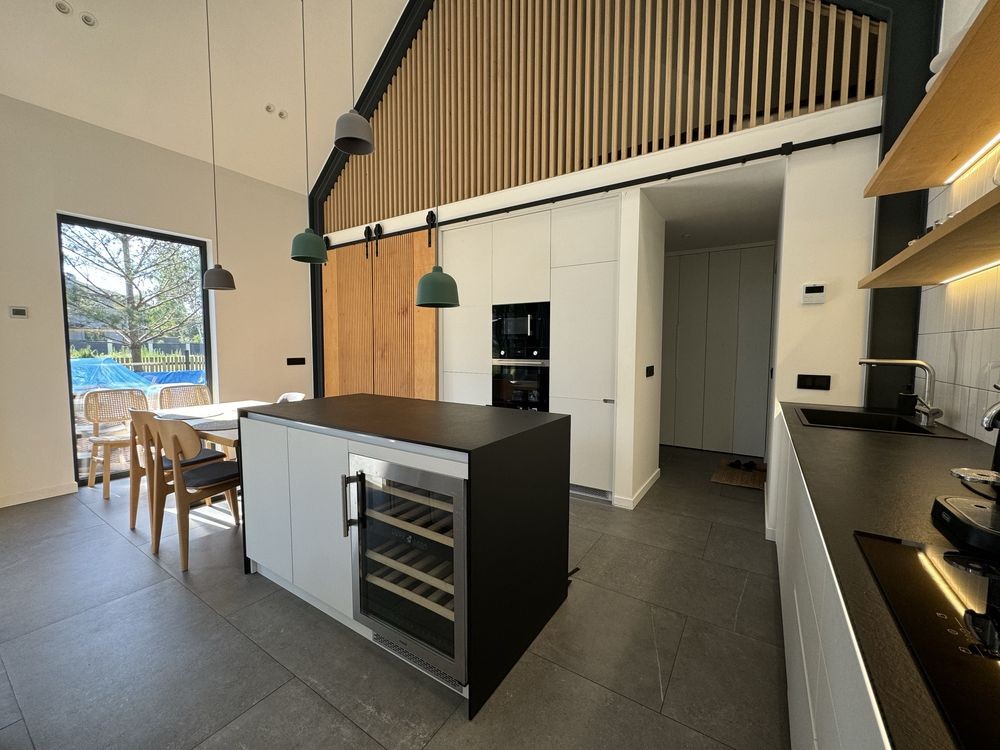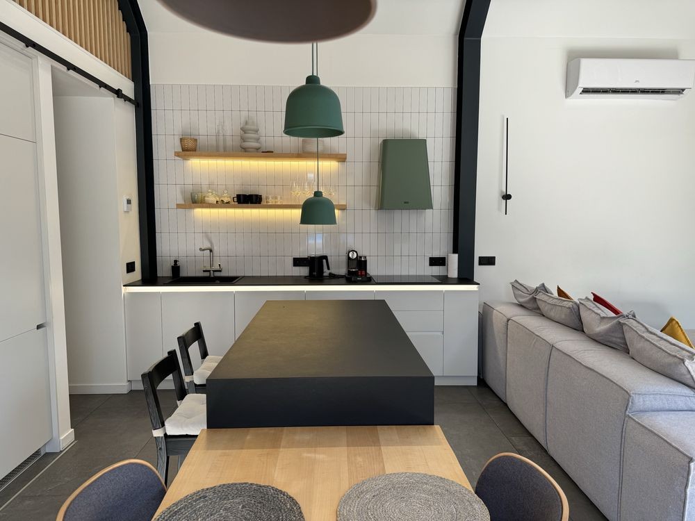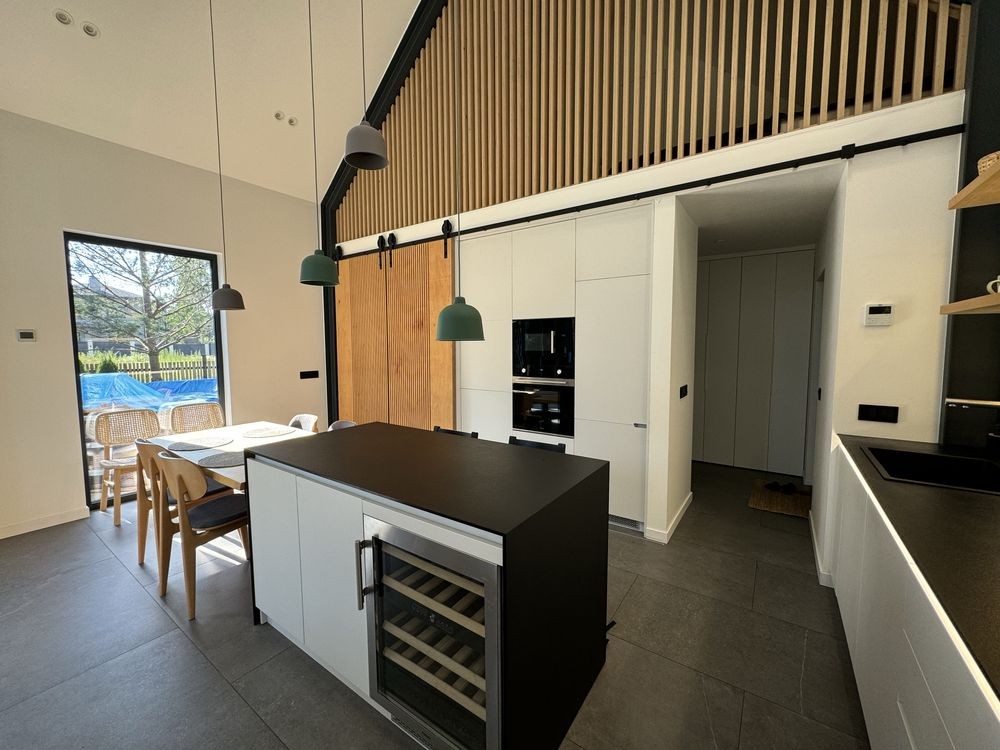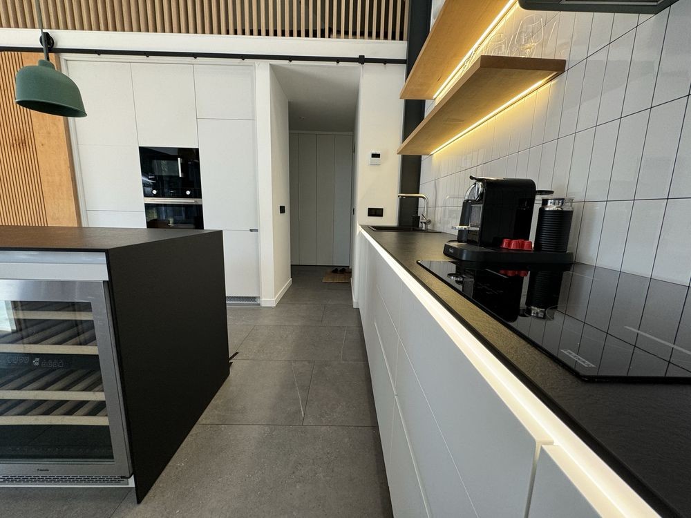Кухня укомплектована всією необхідною технікою: холодильник, винний холодильник, посудомийна машина, духова шафа, мікрохвильова піч, варильна поверхня, пральна машина з функцією сушки;