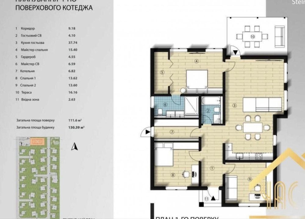 Площа будинку становить 130 м², розташований він на ділянці 5 соток у закритому котеджному містечку з якісним оточенням та зручною інфраструктурою.
