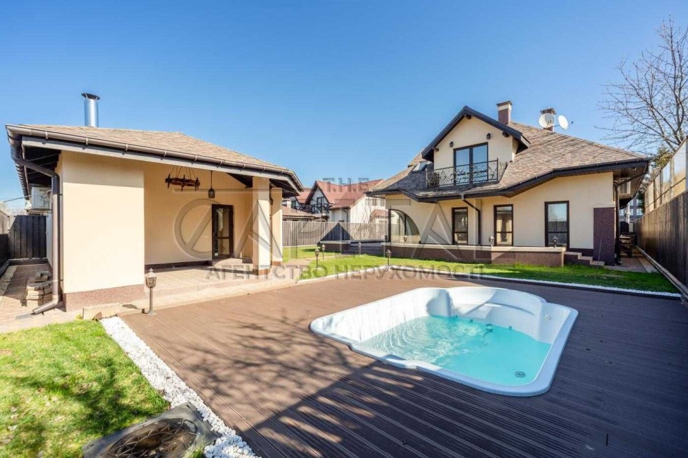 Автополив, рулонний газон, фруктові дерева, басейн з підсвіткою та джакузі.