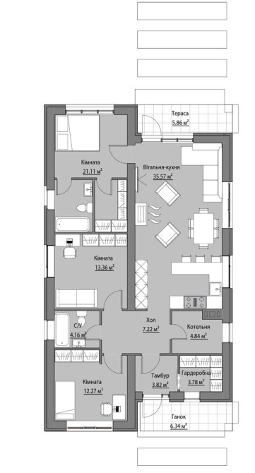 Увесь простір — на одному рівні: Кухня-вітальня, гардеробна, технічна кімната, 3 спальні кімнати, з яких батьківська типу майстер бедрум, тобто з власним санвузлом і гардеробом.