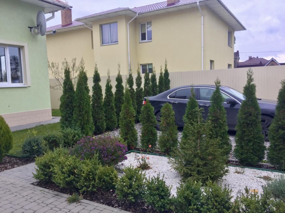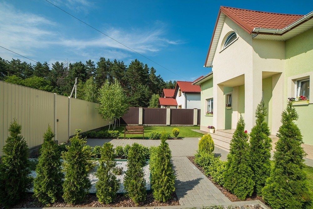 Сучасний будинок поруч з сосновим лісом, розташований в котеджній забудові під охороною.