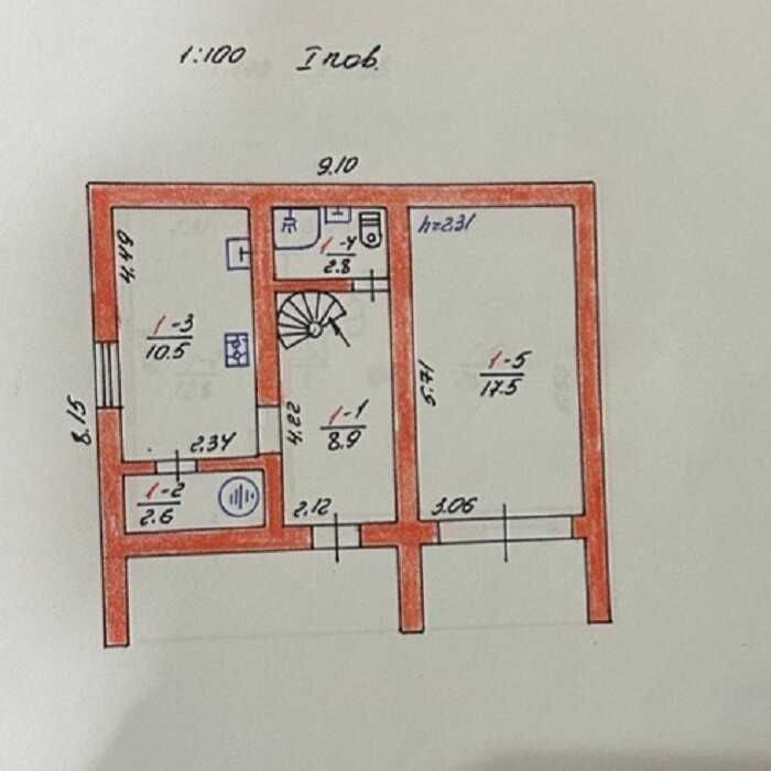 Перший поверх 42,3 кв.м: коридор,котельня, санвузол, кухня, гараж.