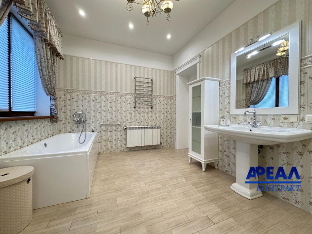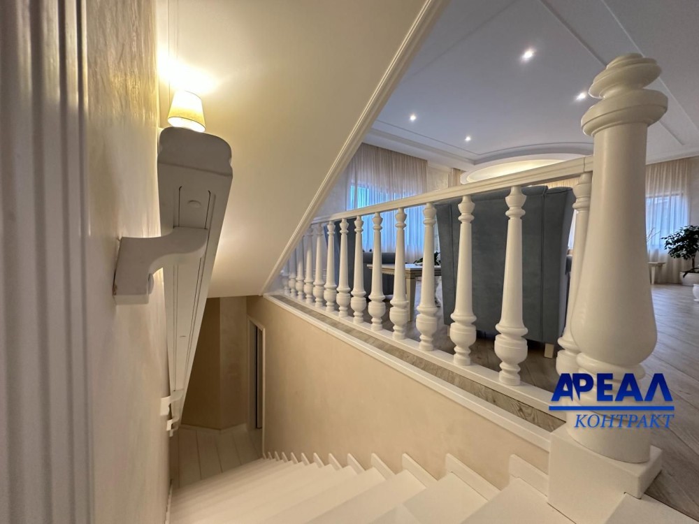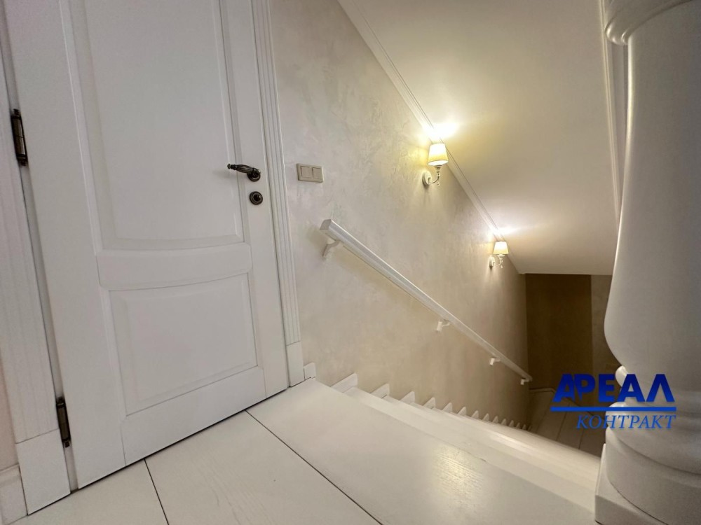 Площа будинку становить 426 кв.м, і кожен метр продуманий з точки зору функціональності та зручності. Перший поверх включає вхідну зону, кухню, простору вітальню для відпочинку та прийому гостей, гостьовий санвузол, а також гараж на два автомобілі з автоматичними воротами. Звідси є вихід у внутрішній двір і доступ до сходів на другий рівень. На другому поверсі облаштовано головну спальню з окремою гардеробною та власною ванною кімнатою, дитячу кімнату, спальню для гостей і ще один повноцінний санвузол. Підвальний поверх — повністю капітальний, в ньому знаходиться кімната відпочинку, технічні та господарські приміщення.