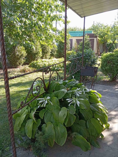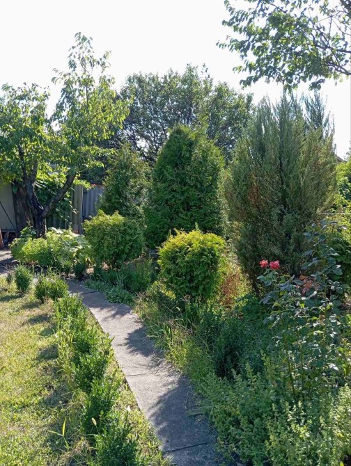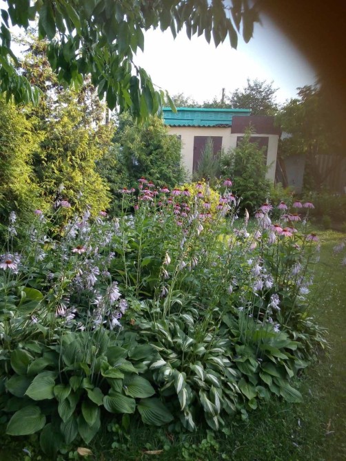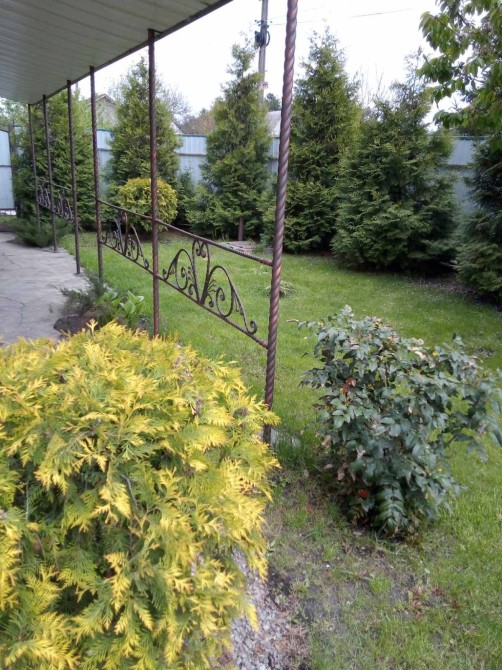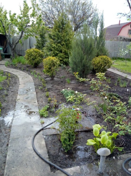 Дача облагорожена різними насадженнями : дерева, туї , квіти.