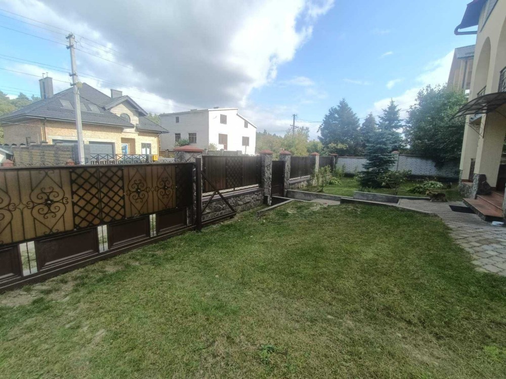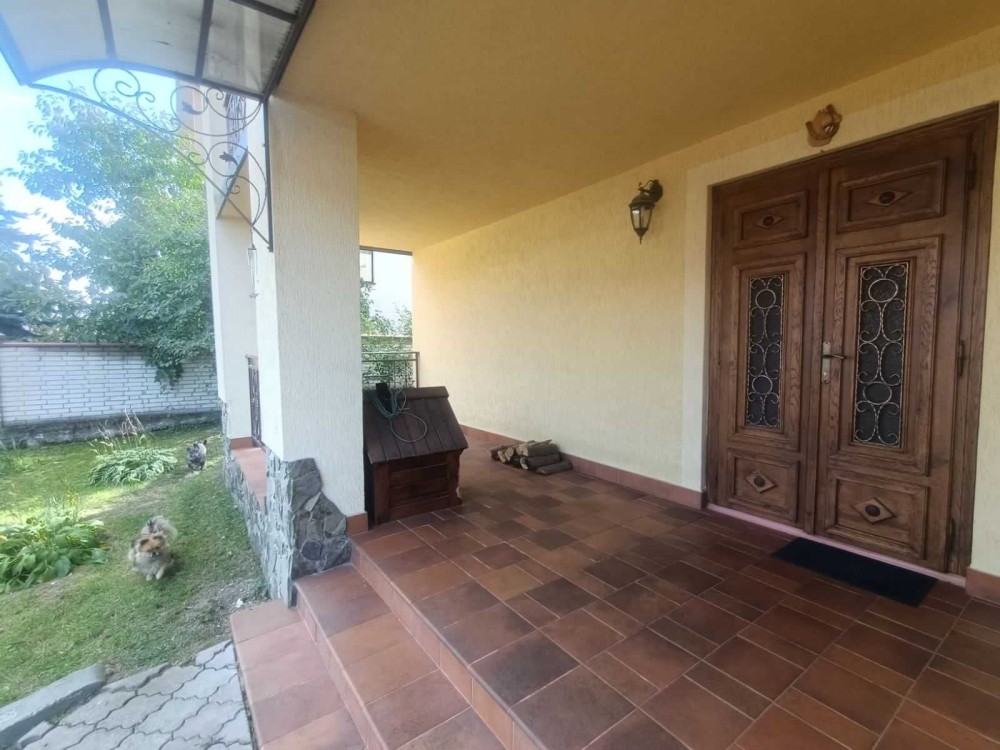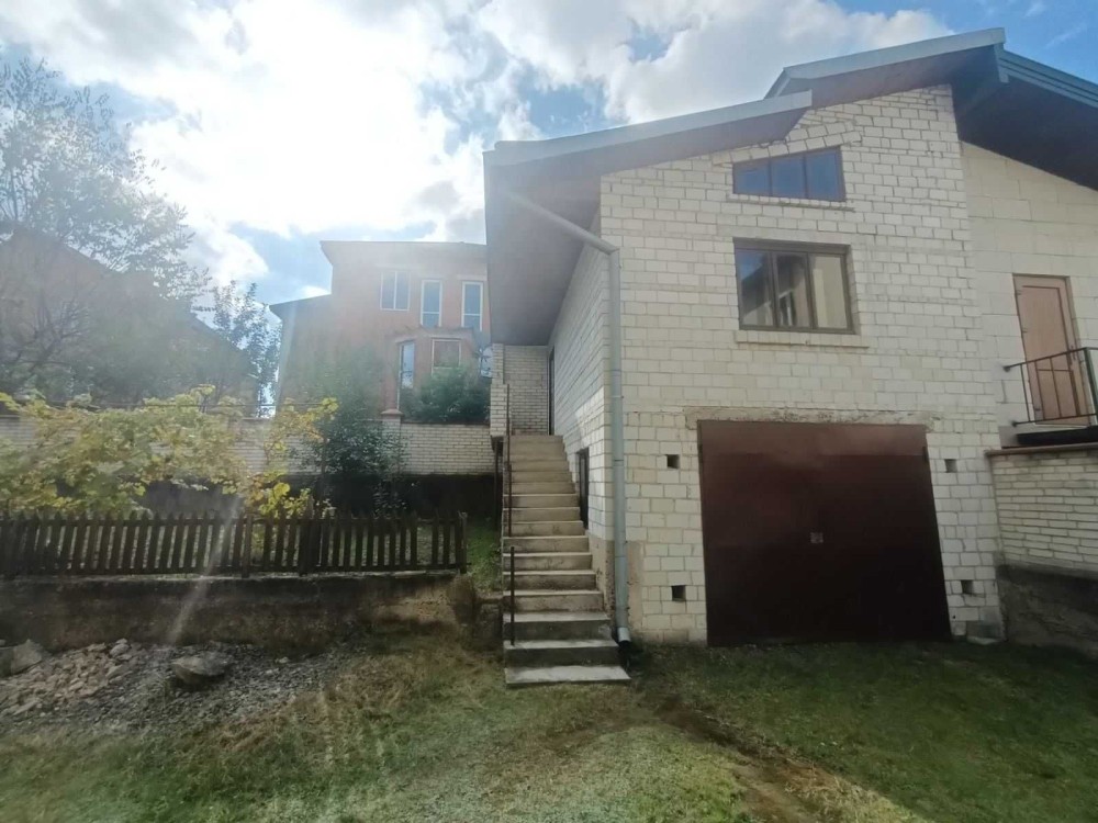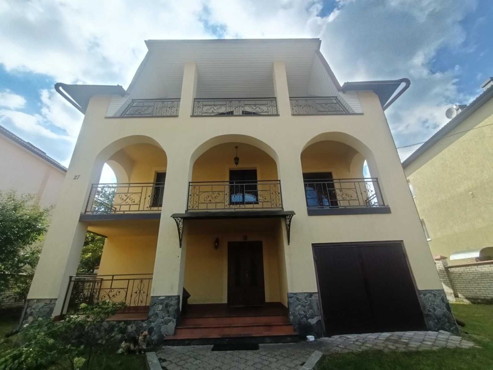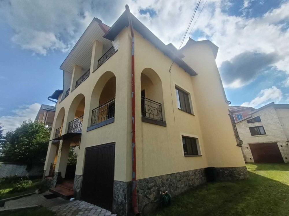 3 поверхи, 320м., 9 кімнат, 3 санвузла, 2 гаражи, підсобні приміщення.