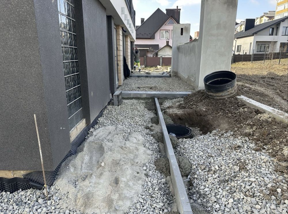 - Благоустрій території, ландшафтний дизайн ділянки з зеленими насадженнями, бруківка.