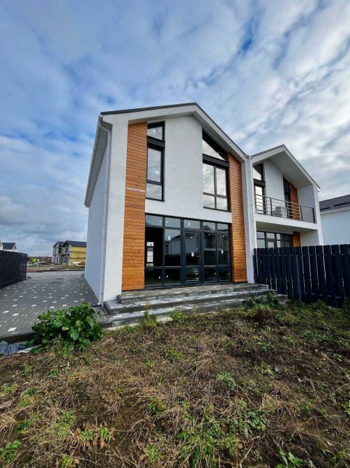 Стильний фасад, панорамні вікна та акценти з дерева -створюють атмосферу простору та затишку.