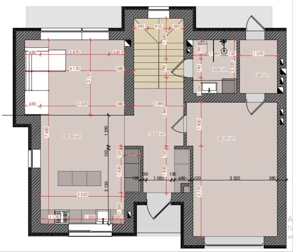 • Зовнішні стіни: цегла М-125 (380 мм), утеплення фасадним пінополістиролом 100 мм