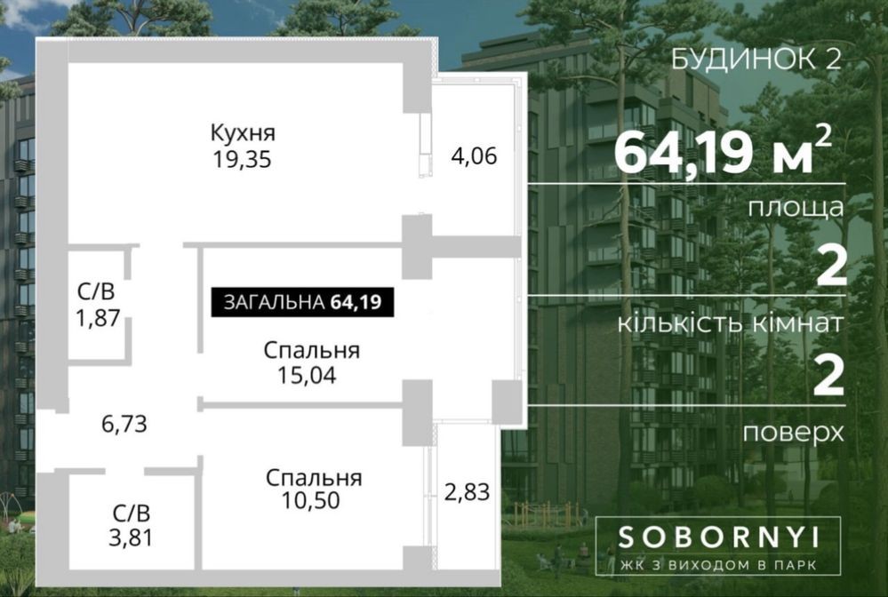 Загальна площа 64,19м2, кухня 19,35 м2
