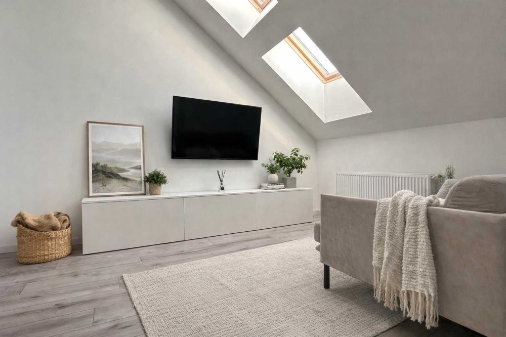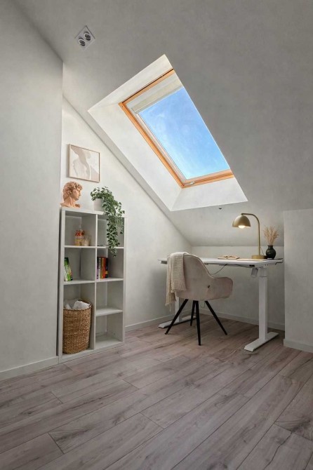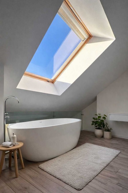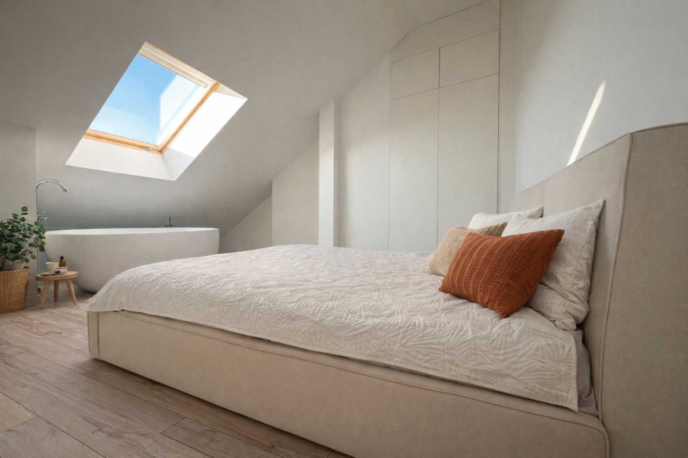 Світла спальня з великим мансардним вікном і панорамним небом над головою