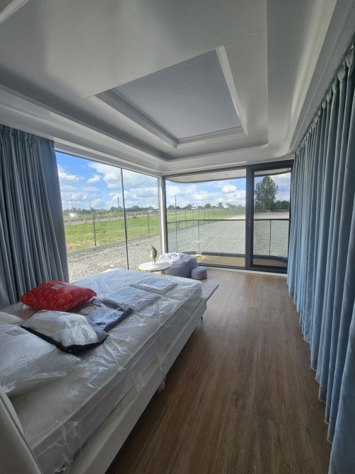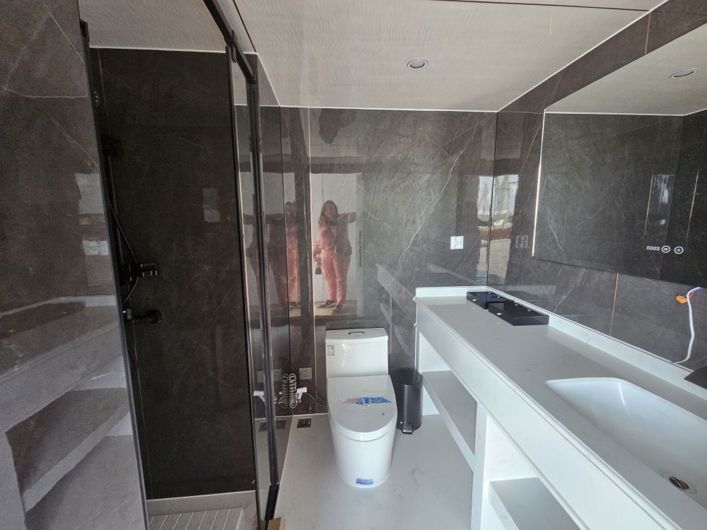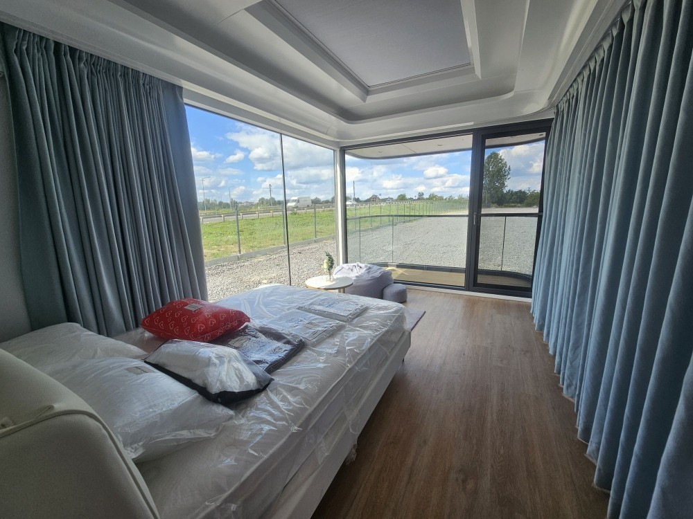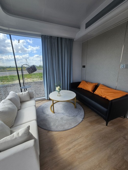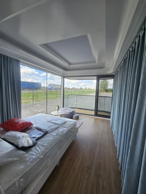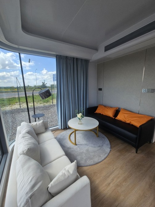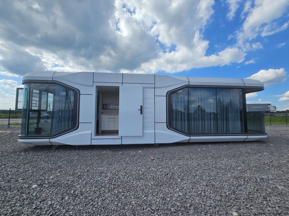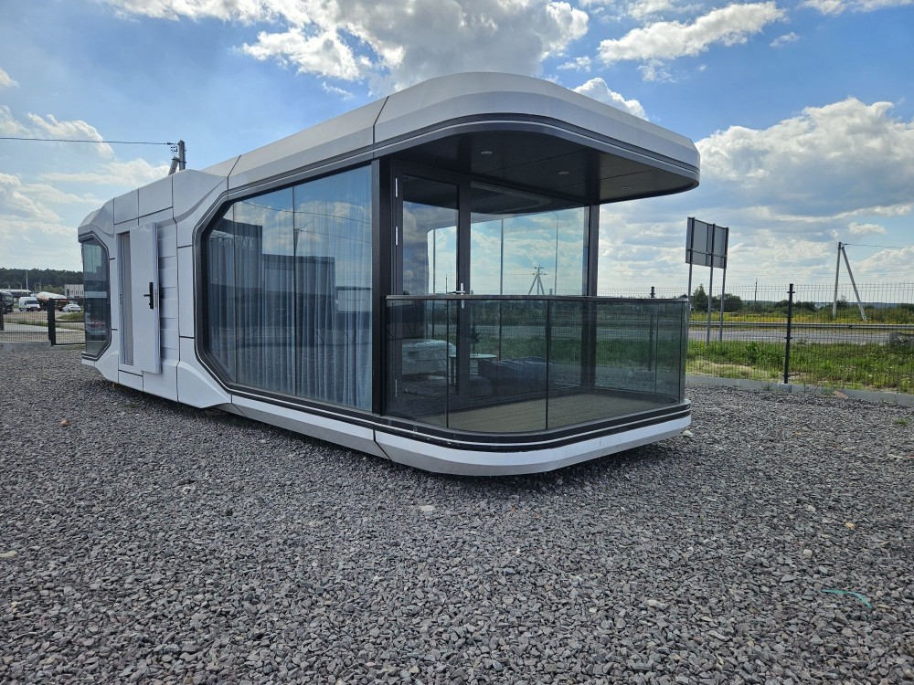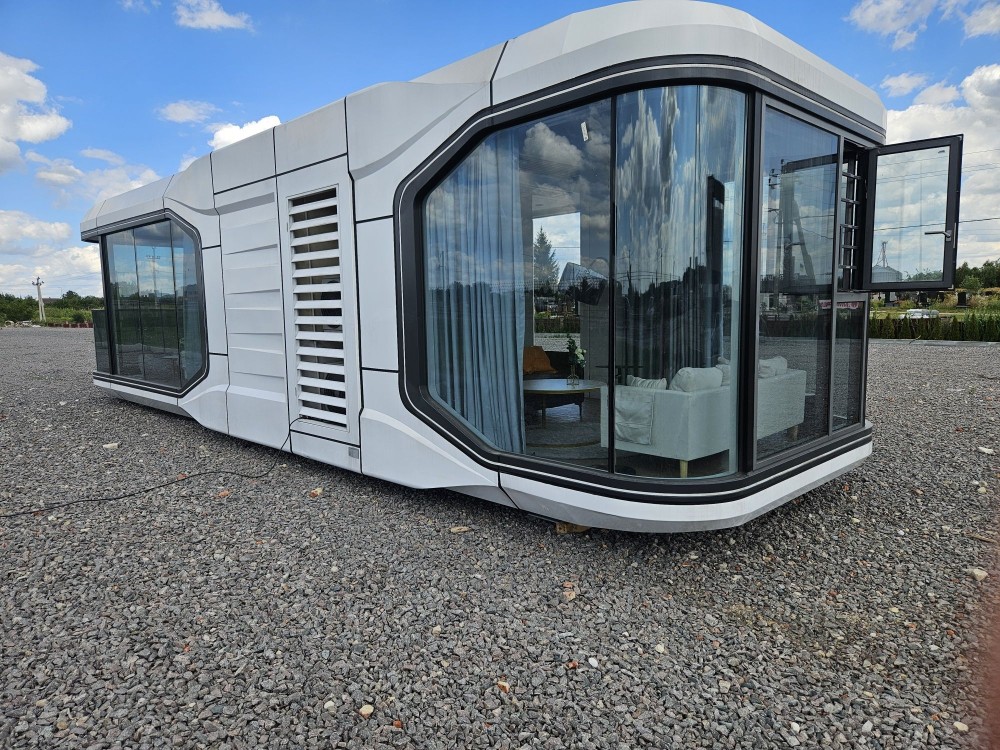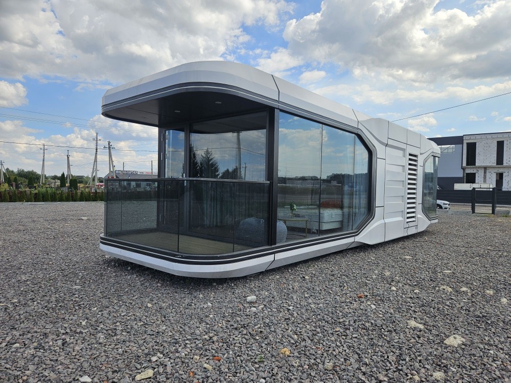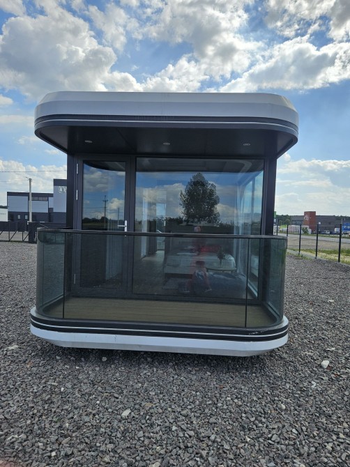 Будинок капсульного типу не розбірний, з балконом, подвійний склопакет, повністю автономний, має вітальню і спальню, санвузол повноцінний, насоси, та виведені вода та каналізація(тільки підключити). Підсвітка лед зовнішня! вага 7250кг.