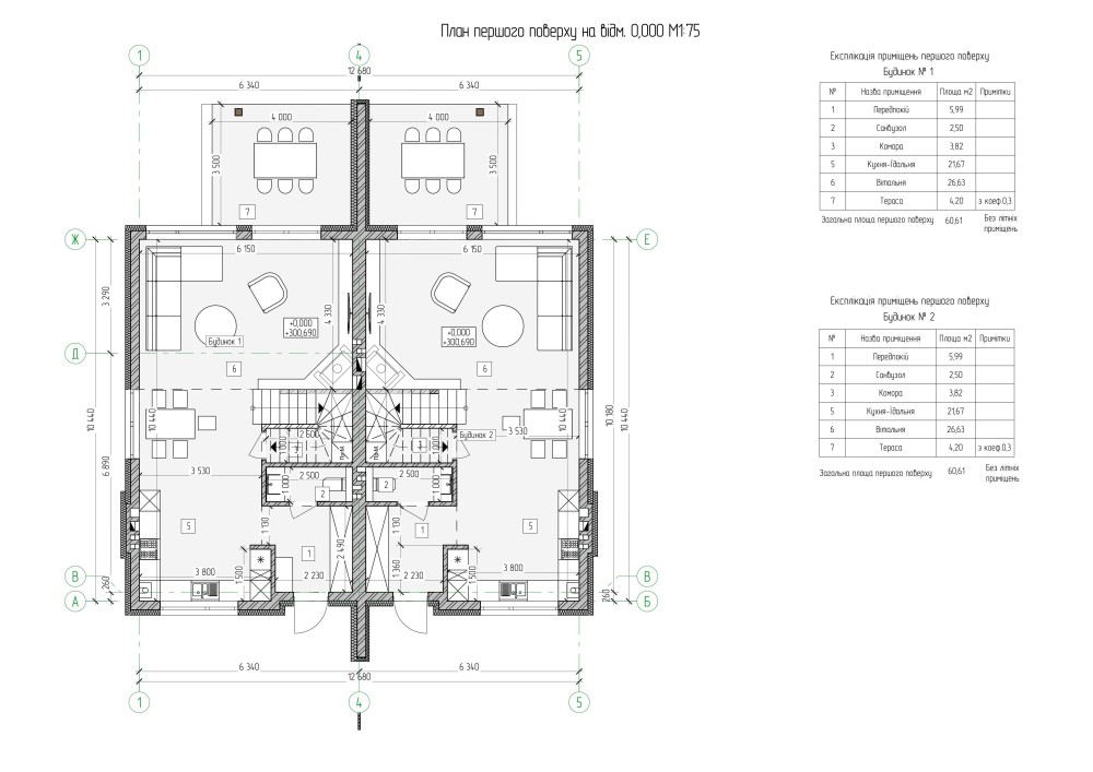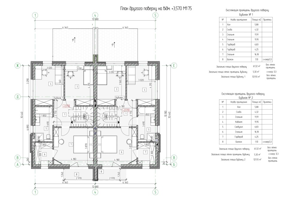 Висота стелі 1го поверху – 3,20 м², 2го поверху – 2,80 м², а також кожен дуплекс матиме своє ізольоване горище.