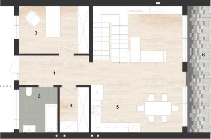 Планування продумане до дрібниць: на першому поверсі велика кухня-вітальня з виходом на терасу, спальня, гостьовий санвузол та комірка.