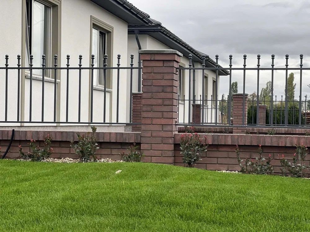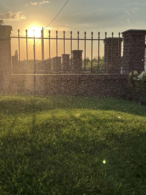 На території біля котеджу зелений доглянутий газон, багато декоративних кущів, туї. По периметру участку якісна огорожа.