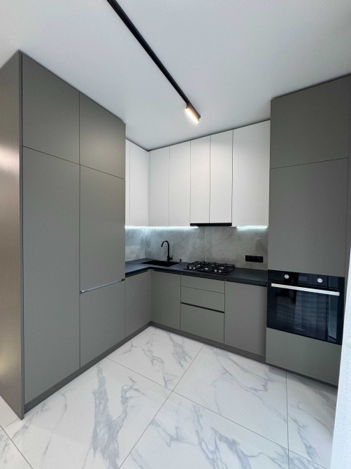 Кухня укомплектована меблями та технікою: вмонтований холодильник, посудомийна машина, варильна поверхня, духова шафа.