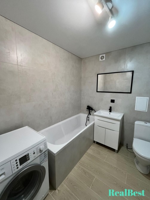 Ванна кімната: простора ванна, пральна машина з великим барабаном, сантехнічні меблі