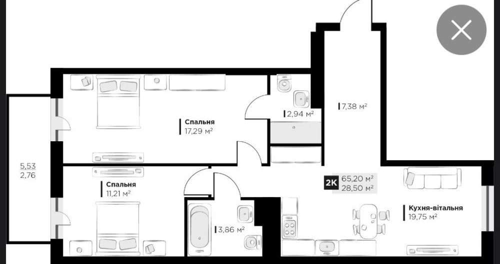 • Общая площадь 65.2 м2