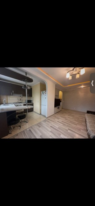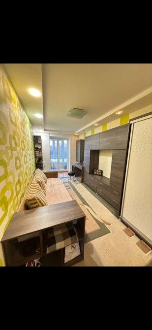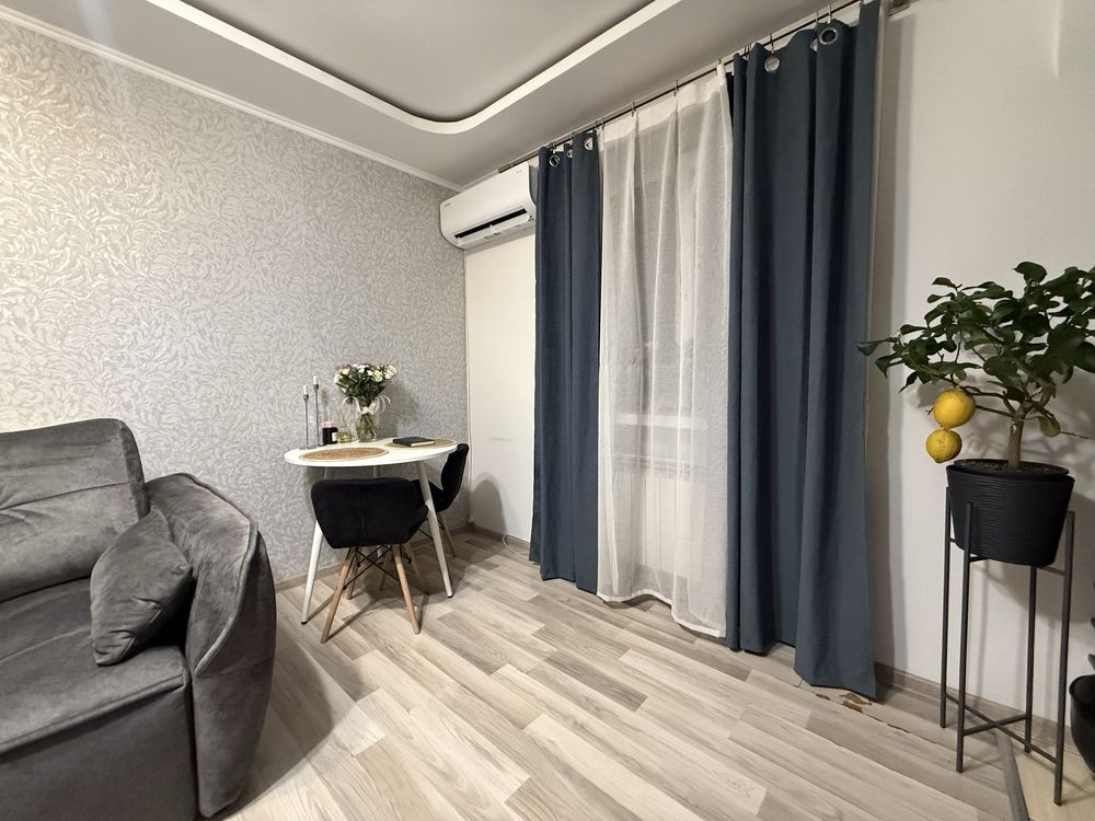 Квартира - студія з двома роздільними ,непрохідними кімнатами . Також вона є двосторонньою ,тим самим вікна в спальні виходять на дворик ,а вікна з іншої кімнати на дитячий майданчик. Є міні гардеробна та засклена лоджія. В квартирі залишається абсолютно всі меблі . Також є газова колонка ,лічильники на воду ,газ та електрику.
