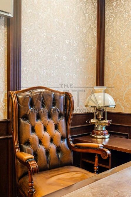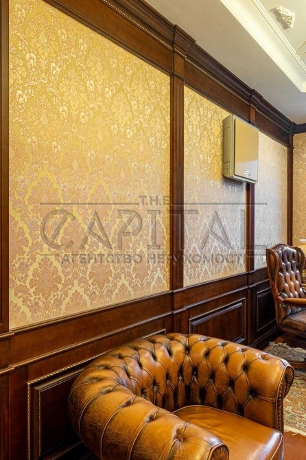 > На стінах венеціанська штукатурка, тканинні шпалери, дерево.