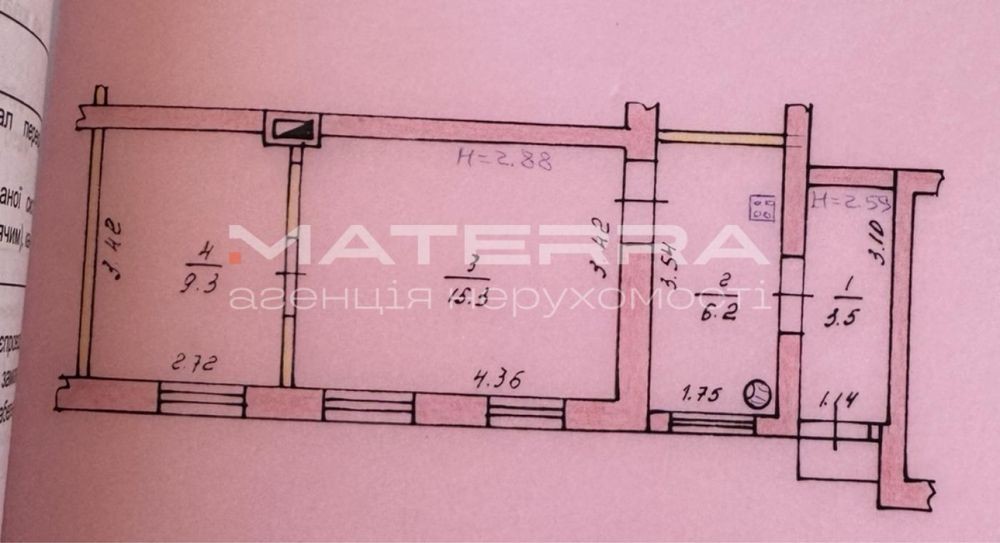 • висота стелі — 2,88 м